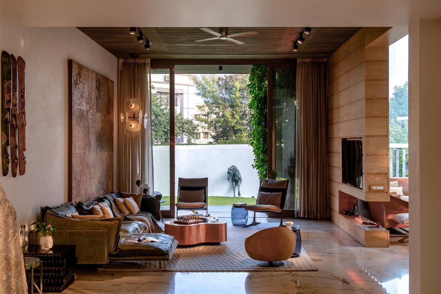 A blend of mid-modern century and contemporary styles with rustic touch up at parts to emphasise feature elements or backgrounds of a space, with these as visible elements, a warm colour palette of was maintained throughout the house that adds value thus enabling to weave the spaces together to bring out the seamless nature of the interiors.The formal living for the house was treated with combination of wood and glass intertwined with double height scale of the entrance and projected canopies in order to regulate views and exposure, augment the interiors of the space with respect to the warmth of the sunlight throughout the day. The central part of the house where all the living spaces come together was enhanced with thin metal structured elemental staircase which has been treated with black paint to give the metal stairs its thin structure a heavy feel simultaneously compliments and highlight the warm tone of wooden elements.The bar area in the basement was treated with interesting colour scheme that sets the bar space apart from the rest of the house, Keeping everything colour coordinated, the quaint bar bears a timeless finish.A 20 year old scooter has been restored to new to use as an artefact for bar area and the ceiling is designed with the concept of water ripples.