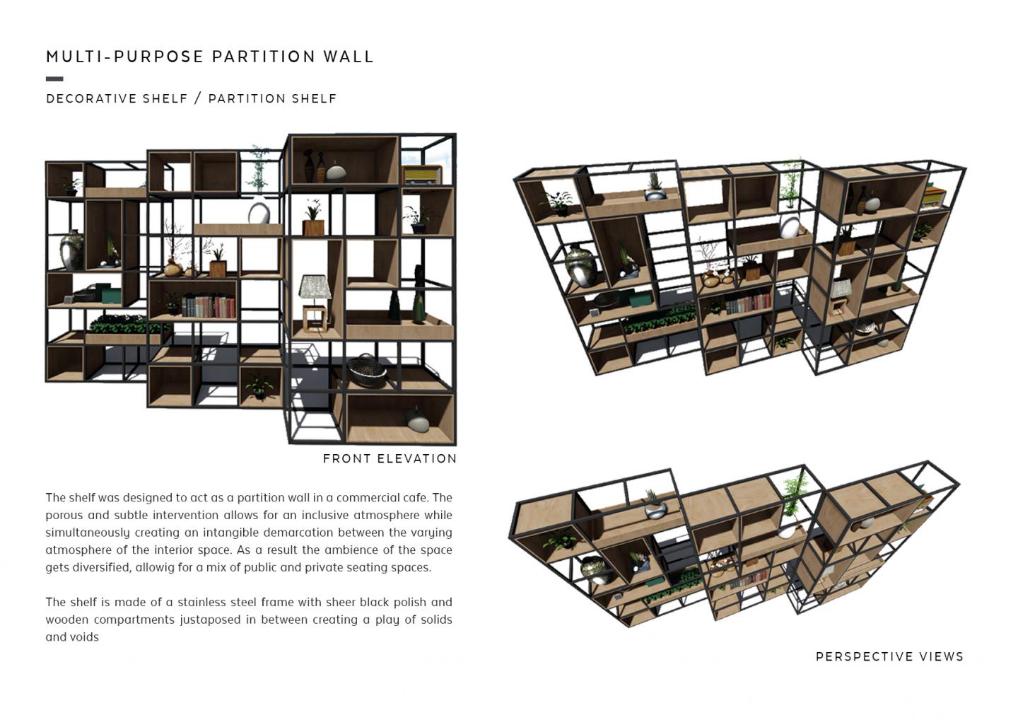 A multi-functional screen acting as a display unit served the purpose well. It offers private spaces as well as a transitional area. The idea was to create a partition wall for a cafe in order to create diversity in sitting spaces without any visual barrier.
