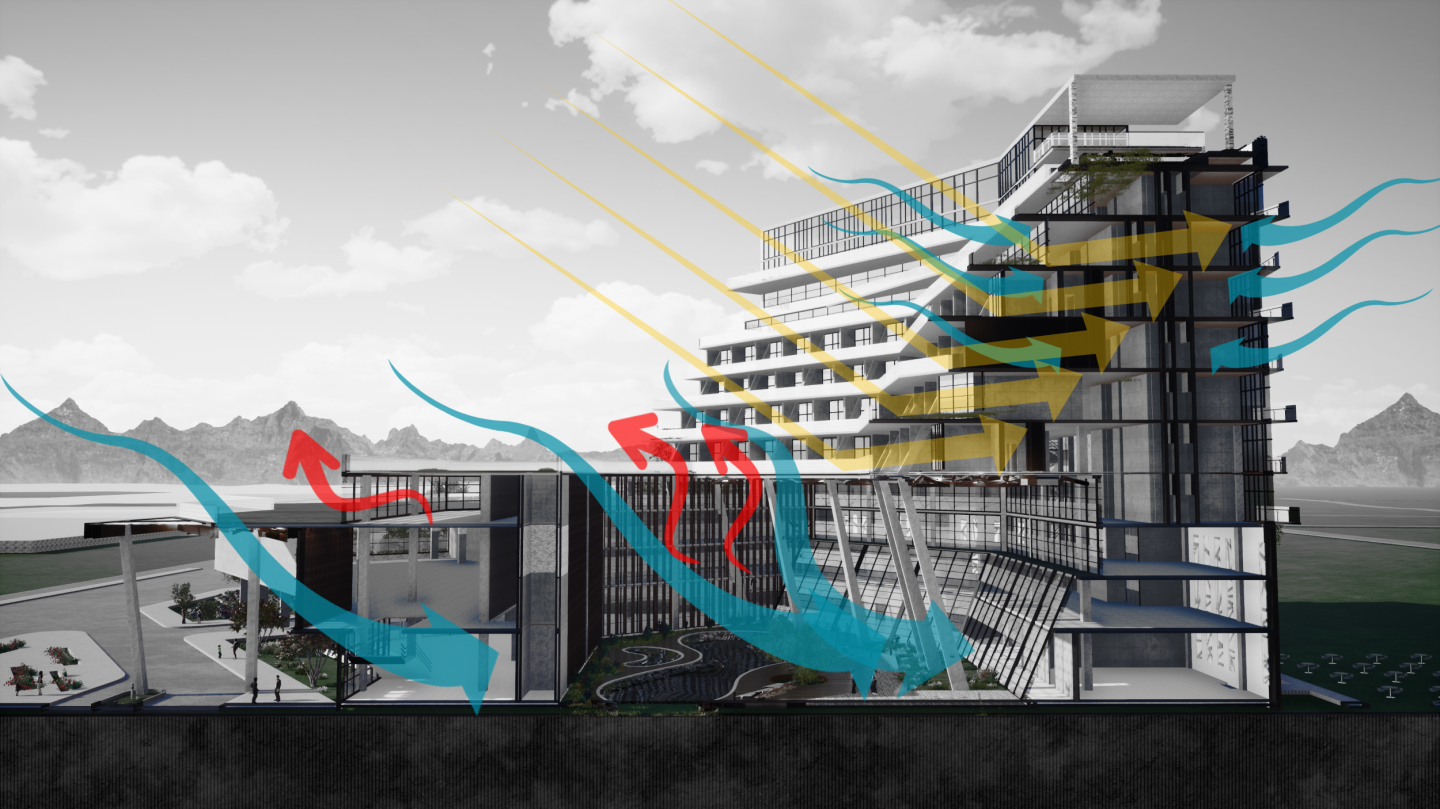 The open terrace will work as rainwater harvesting, vegetation, and as the tourist come in winter so the vegetation will help in dropping the microclimate temperature that will limit energy consumption. The three terraces will increase the quality of space as they will use for various purposes. The main aim of the project to gain sustainability thinking about the context and provide the best to its consumers. The building has the thermal insulator which will save energy consumption also providing triple-layer krypton loaded glass which also uses an energy consumption. Also providing the green buffer will create the environment friendly and less carbon while also create less humidity which is a great problem in such a tropical climate. With geothermal the project itself gain closure to net-zero building. also providing the strategy of thin-film solar collection of energy from the sun. With all the measures have been taken for the best output to its context and nature.