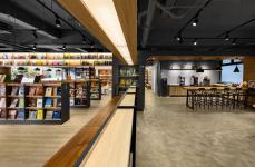 Different from the traditional bookstore, designers set a high bar table next to the buffet beverage area, to create a relax space so the costumers can come here enjoy drinks and chat during visiting bookstore.