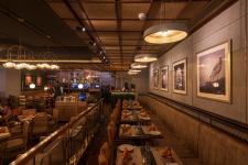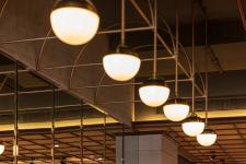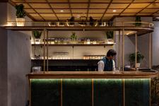 The entrance welcomes the visitors with a painstakingly curated wooden façade done in an idiosyncratic horizontal-vertical pattern. This façade fabricates a three-dimensional pattern setting apart the indoor restaurant space from mall corridor, while maintaining a barrier-free sense of connection between the two.