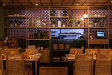 The bar serves as the focal facet boasting of green and gold accents while supplementing the essence of vitality. Planters subsumed in the design infuse a silent connectivity between the built environment, the users and the natural environ. The traditional props kept on the bar backdrop marks the eccentric regional dialect. The open kitchen at the back with pottery props and terracotta jali adds a pop to the overall aesthetic value.