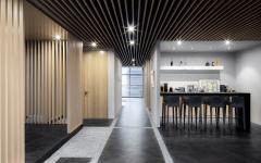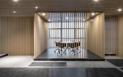We particularly expand the distance to the edge of the building and then forms a long corridor between two sides of timber grilles, which along with the glass wall of the building. When the twilight is arrival, the sunlight through the louvers to the floor, shaping a line by line lightings and shadows alternately. Walks along with the corridor, showers in the nature lightings, or stays and foresees the city landscape, all these bring a ritual feeling and experience.