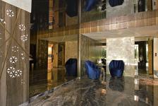 The lift lobby has wall panels finished with sibu sheets and bronze mirrors, flooring done with golden Morocco marble and the most distinctive feature of this area are the lights finished with gold.
