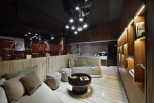 The terrace lounge is the epitome of bliss and splendour. With its wall panels clad in resplendent silk wallpapers, ceiling covered with gold leaf and Armani marble for the floors the lounge gives the quintessential majestic appearance with a tint of gleam. Pink mirrors used on the walls break and soothe the use of heavy and opulent materials in this space.