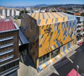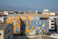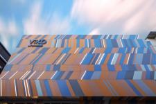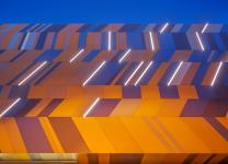 XL Architecture+Engineering proposed a triple mechanism design strategy that also characterizes XL conception of architectural design. Architectural meaning is subjected to latency: In this case, the envelope which is composed of porcelain tiles in the colors of General Electric, Osram and Panasonic are intertwined so as to define new relations within their surroundings and themselves.