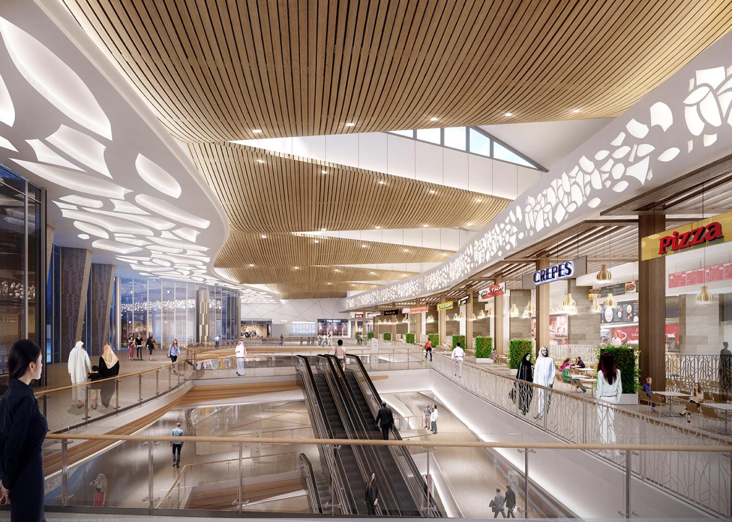 The Mangrove Atrium, the heart of the mall, is the largest open space, programmed to host different events and acts as the main access point from the parking levels situated above ground. On the top floor, the Mangrove Food Court evoques the mangrove forest with patterned columns in shades of green and blue which emerge like trees, with two skylines that fill the space with natural light.