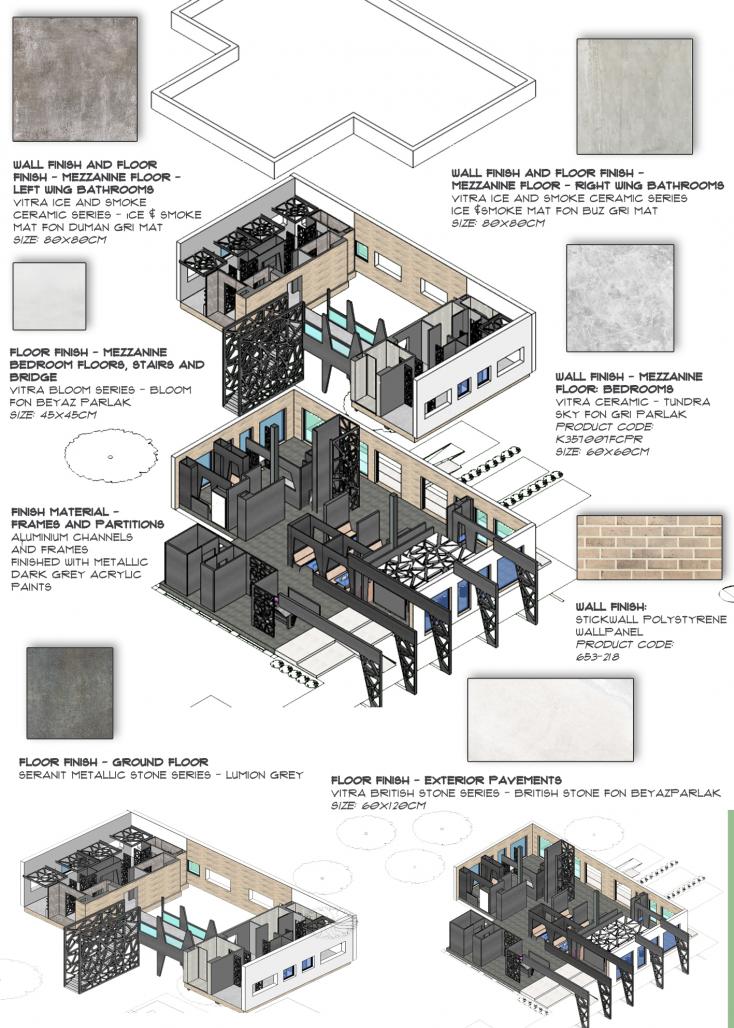 This is an interior design project of a guesthouse for a fashion designer along with his/her design team. The exterior and the structure of the building is already built, so the challenge is to design the interior of the building. This building was previously used as a residential building, so in this particular project the function of the building will be preserved. However, the users will not be permanent and will be changing from time to time. The architectural program should include an accommodation space for up to 7 people, a dining space, a kitchen space, a library and working space, a meeting room, a lobby, wet spaces (toilets, laundry rooms, mechanical room), storage spaces and an office space for the staff. The interior spaces should also include public spaces, since there might be other people (apart from the guests that are accommodating) coming to meet with the guests and to participate in workshops. The ground level is composed of both public spaces which includes; the entrance, lobby, office spaces, meeting room, lounge space leading to the exterior garden, and semi-public spaces which will mostly be used by the guests that are accommodating which includes; open kitchen, dining space, laundry room, storage room and a library. There is a lift and a staircase leading to the first floor which is the most private space consisting of all the accommodation spaces.