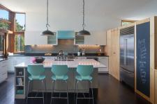 This hillside home is 2600 square feet with two bedrooms. Similar to its sibling shoreline home, Seaview Escape, it is done in the Pacific Northwest-style, with wood floors and an expansive two-story glazing allowing a view of the mountains from the upper balcony. Cantilevered wood “floating” stair treads lead to a library overlooking the double-height living and dining space below. Beach glass and nautical light fixtures were chosen for the bathrooms to bring a coastal feel indoors. A stone mass wall with corten panels provides the focal point of the living space, housing a fireplace and media center while providing separation from the master suite. The house is connected to a wooded pathway that leads to the beach.