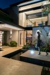 The approach to the house was designed to include a walkway over the water feature with a podium for a sculpture. An existing study was kept for the owner’s wife as a home office, as she sees clients at home, with a view of a Regardt van der Meulen sculpture over the water feature.