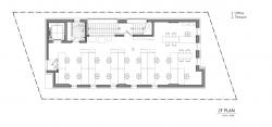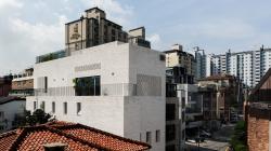 This building was designed to house YKH Associates Architects in Seoul, Korea to include at least 40 work-stations, a large conference room, two small conference rooms and two separate offices for two principals and a roof garden. The site is a small, long rectangular shaped area of 219 Square Meters with a level difference of 4 meters between a 4M-wide road and a 6M-wide road located in the tight residential area of Gangnam Gu, Seoul, Korea. The building code allowed FAR of 200% and maximum site coverage of 60%; there was an additional building code requiring a diagonal sun-light path on northern side for neighbors.