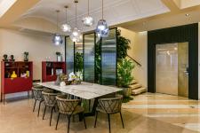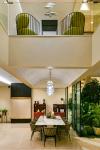 The formal living room consists of both a seating area as well as the dining. A remarkable feature of this dining area is the vault ceiling. The awe-inspiring dining table is the star attraction which is further augmented with a tropical background.. The silhouettes of the tropical jungle are infused in the backdrop, adding to formulate as a surprise element. A true scale antelope that sits amongst the jungle peeking through the partition symbolizes elegance, high energy levels, communication and wisdom. The double height void overlooking the breakfast table at the lower level has been cladded with diamond shaped wooden pieces. The creative console, mesh chairs and the bookcase are astonishing and draw architectural detail.