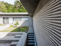 Four volumes are positioned at a different level in responding to the sloped site. Each volume of space is arranged in the form of Korean traditional houses. The living quarter was divided into sectors with individual volumes and separated with outdoor space. The corridor is a mediator between outdoor and indoor space. As these four integrated volumes in different level positioned, various levels of openings are deployed. For this construction, continuous wall girders with horizontal beams are used to lift to create void space: openings for the entryway, garages, lights and views. Each opening frames out new boundary and brings new relationship of outdoor space.