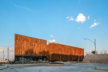 The suburban context of isolated buildings scattered on a hilly site suggested that the building could merge with the landscape by using colors, shapes and materials that could suggest a large rock made of red minerals and a green platform. The metaphor had to be subtle but clear and very architectural, so we selected perforated Corten steel and a faceted skin to wrap the building.