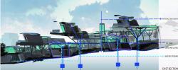 Algaes are a group of micro-organism that can capture the sunlight & CO2 & wastewater and provide sources as the energy & fuel & O2 & clean water. Throughout the site, Algae is used as suncatcher panels& handrails & ornaments & lamps on the commercial buildings and research centers. Moreover, in the production node, algae farming is made on the lake.