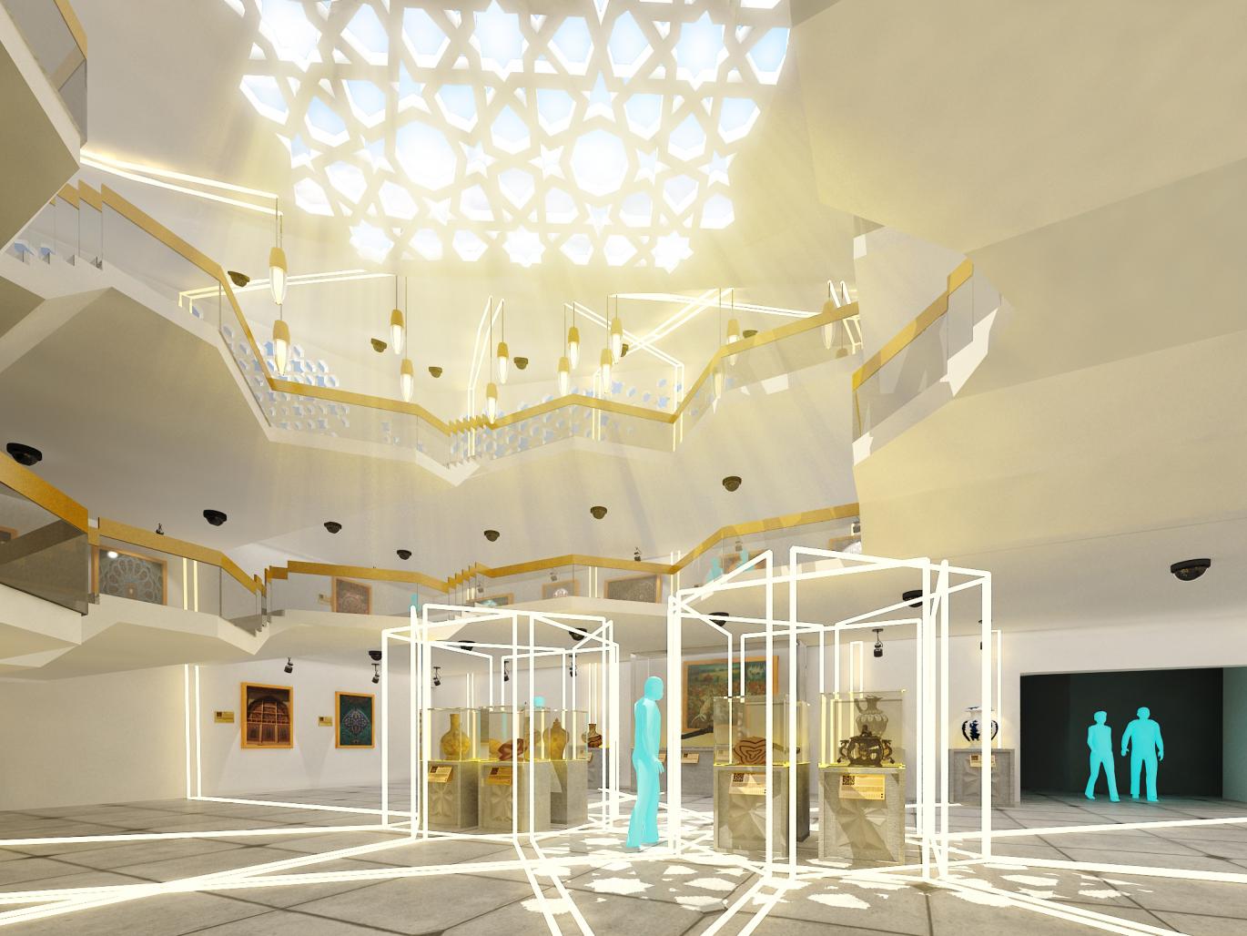 Art in the Muslim world has always had an unbreakable connection with light. In other words, light is one of the finest, most subtle and most amazing, semantic meanings in Islamic art And this reflection is shown on a variety of arts, such as architecture, painting and crafts.Pointing out this issue in the design, the light rain caused by the passing of light from the Islamic knot at the ceiling and walls and entering the interior space of the museum has been done.