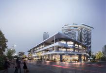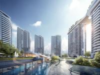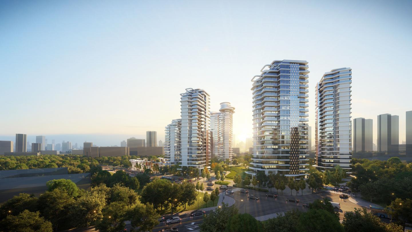 The project consists of six high-rise buildings, each of which is a separate island, with a west high east low height different. It creates a round patio in the center. The broad view of 60-meter sky floating garden, the simple yet flexible commercial, dynamic residential towers and urban context, altogether form a picturesque city skyline.