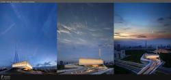 The skin of the building is made of see through concrete material that looks opaque during the day time and will light up at night through interior light coming through its engraved Islamic pattern.