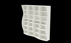 Waveshelf has the potential to come in a wide variety of sizes and colours. Currently there are two versions of the bookshelf. There is the original, 296 x 48 x 236 cm Waveshelf, which is finished in white lacquer. There also is 176 x 30 x 176 cm Waveshelf Small, complete with 6 vertical panels, 6 shelves, and that gradates from a dark gray colour into white, lending it more than one colour and form effect depending from which angle your looking at it.
