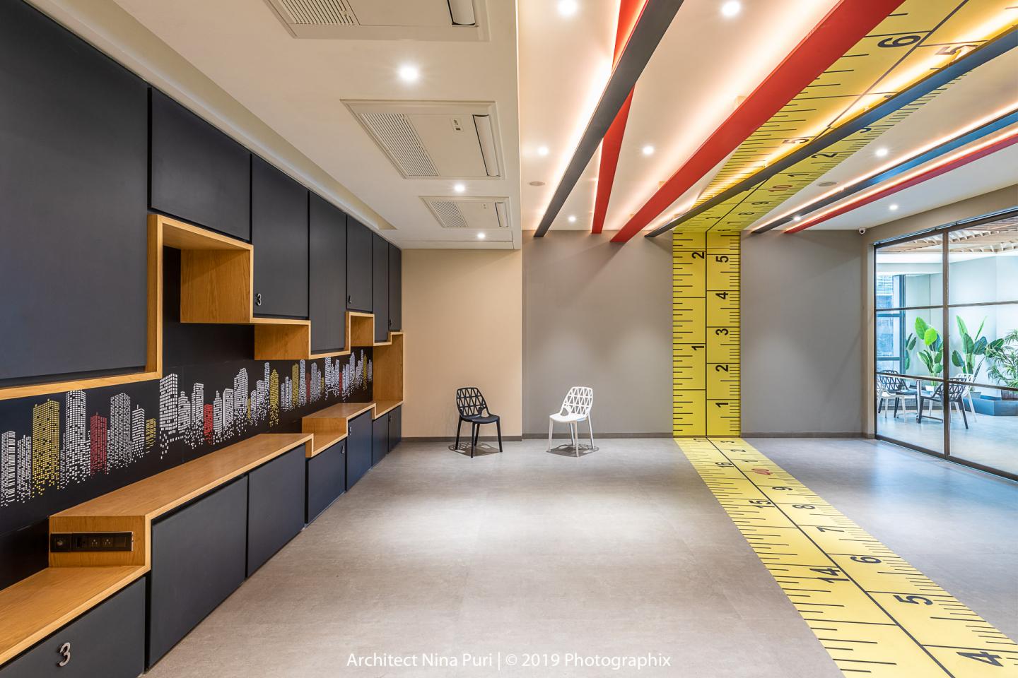 Alluding to the nature of the company, word graphics, a bright yellow measuring tape cutting across the floor and climbing up vertically onto doors at either ends and a punctuated storage unit enliven the office spaces interestingly .