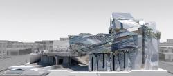 The essence of the design lies within the main facades, as they combine overwhelming rock-like forms with subtle golden mineral-esque particles according to the texture. The texture of the building was generated by combining a blue matte coloration with a Chinese roof pattern through artificial intelligence. From this texture, a golden patina is extruded, adding a layer of 3-dimensionality and ornamentation to the overall design. The golden pattern envisions a new methodology of thinking for architectural imaging and texture treatment.