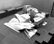 The design is a composition of forms derived from photogrammetric scans of architectural elements including an upturned roof detail, a column base, and ceramic shingles obtained from Chinatown. When seen from above, the diverse shapes that compose the building have individual formal qualities which syncronize together through materiality and texture treatment. The vertical blocks that surround the holistic design host the private office and co-working spaces of the complex, while the horizontal shapes include a public theater, retail stores and a cafe. The interior oscillates between closed and open spaces, ranging from submerged passages to outdoor walkable terraces, from intimate hot desk slots to open co-working areas. As seen in the section, office spaces, retail shops, commercial areas, and outdoor floors coexist throughout the project through hybridization of program and form.