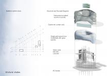 The building depends on three main ideas: the monumental staircase, the atrium, and the office space zoning. Upon entry to the building, users are welcomed by a monumental staircase which symbolizes the formality of banks while creating visual connection and openness to the space. This element is aided by the atrium which creates views of the different working environments as well as views to the lower public sect. Finally, the offices are arranged to fulfill the concepts of "think, create, communicate ". The think zone is in the inclosed offices to provide an isolated and private environment. The create zone is in the open offices due to the flexibility of the area in order to enhance productivity. The communicating space is within the link between the two departments and holds a mix of enclosed and open spaces. These concepts are reflected in both the massing and facade treatment.