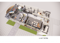 The meeting room can be used in a prestigious and versatile way. facade with a round and amorphous surface will be covered with composite aluminum material. Due to the high height in the meeting room, wooden coating will be used to prevent sound distribution and to provide a suitable acoustics. Round acoustic materials to be used in suspended ceilings will serve this purpose.