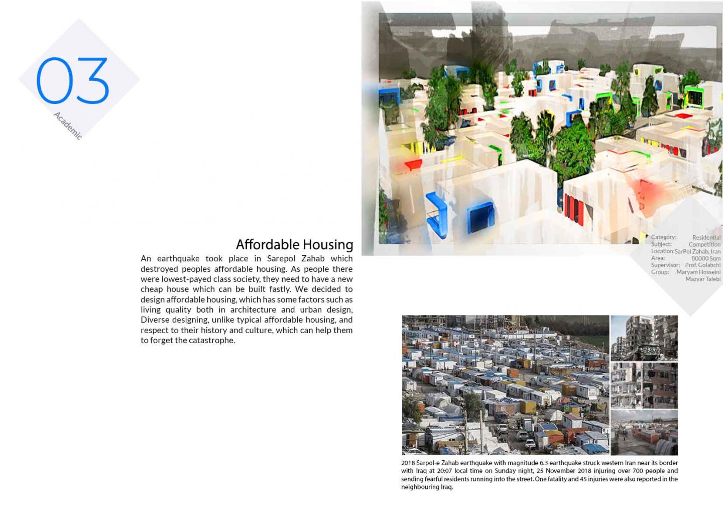 An earthquake took place in Sarepol Zahab which destroyed peoples affordable housing. As people there were lowest-payed class society, they need to have a new cheap house which can be built fastly. We decided to design affordable housing, which has some factors such as living quality both in architecture and urban design, Diverse designing, unlike typical affordable housing, and respect to their history and culture, which can help them to forget the catastrophe.