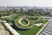 The building concept is a "Farming Kindergarten" with a continuous green roof, providing food and agriculture experience to Vietnamese children, as well as a safe outdoor playground. The green roof is a triple-ring-shape drawn with a single stroke, creating three courtyards inside. While these internal courtyards provide safety and comfortable playgrounds for children, the roof makes landing to the courtyards at both sides, allowing children to enter a very special eco-friendly experience when they walk up and go through it. This green roof is designed as a continuous vegetable garden, a place to teach children the importance of agriculture and relationship with nature. The building is covered by vertical louvers made of pre-cast concrete, which is utilized as "vertical garden" for creepers such as bitter gourd and cucumber.