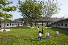 In order to grow the environmental consciousness of children, it is essential to make the gardens familiar to them. So the roof is designed as a three dimensional strip with gentle slope, connected to the courtyards - the main playground for children - at both ends. Thanks to the from of this roof, The fluidity of activities is achieved, which naturally lead children to the vegetable garden roof.
