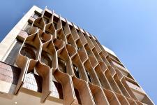 This innovative use of material is the main concept of the project, while these louvers contribute to sunlight and climatic control, aesthetically are modern derivatives of Iranian archetypal geometry and pays a tribute to Pahlavy architecture as a context.