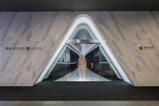 To enter the hotel, visitors are guided through an exhibition space at ground level and brought up by elevators to the reception on third floor. The exhibition area is designed as a “time tunnel” that aspires to create a surrealist experience of travelling in outer space. The journey brings visitors passing through art works and reshapes their state of mind before check-in. An illuminated pitched ceiling, inspired by the company logo, hovers above the dark space as an eye catcher, attracting people from the street to come in.