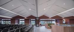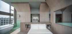 The hotel reception features a triangular atrium of 7 levels- the “SAVHE”. The “SAVHE” is designed to achieve “A moment of Respiration”, where the visitors are invited to slow down, pause and meditate for a while. The striking scale of the space is reminiscent of those in chapels. The verticality is celebrated to draw our views all the way upwards to the sky. The atrium is enclosed by a continuous bookshelf spanning 3-stories high, together with the upper building facade painted in matching color. A transparent membrane canopy is added on top of the opening, protecting the space from weather while allowing natural light to cast down and enliven the space. A reflection pool centers the atrium and captures the changing light of the day and renders an atmosphere of serenity.