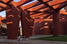 Traversed by a series of linear trapezoidal frames and sun-breakers, this focal area has a constantly changing shadow pattern depending on the sun direction throughout the day.