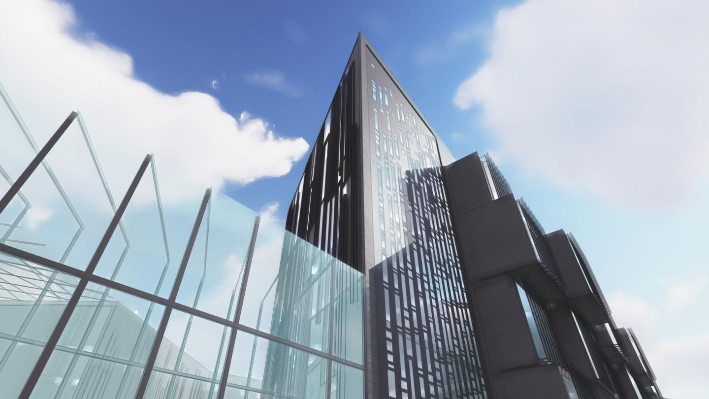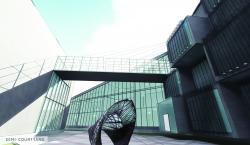 The digital façade on the main entrance is composed of screens that project the external movement in the form of abstracted figures, reflecting the high-tech aspect of the program; thus, merging the explicit form and the implicit program in essence.