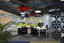 5. Since the client has a very large number of young workforce, they needed the HR and interview area to be the central attraction / focal point on the floor. The area needed to have ambience in such a way that it becomes a major driving force behind successful recruitment and retainership for the organisation. Stretch ceiling fabric with sky theme, carpet with cobbled stone pathway effect and bright coloured workstation fabric in this area, make it a centre of attraction for the entire floor. Also, interview room furniture in every room is different here, portraying the culture of the organisation. So somewhere it’s a bar stool with bar table, at other location it’s a lounge seating with coffee table in front.