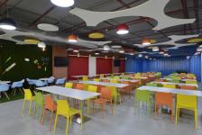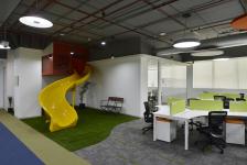 The design style adapted was modern yet with a theme of nature interwoven. So right from the moss in the reception, to the “ walk in the woods “ towards the cafeteria or the “ learning tree “ collaborative space to the acrylic birds in the ceiling to the grass floor in café, every space has a touch of this theme.