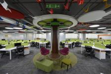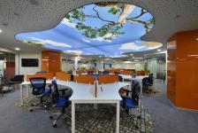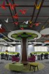 2. a few collaborative areas in the office are in form of a “ learning tree “. So you sit under a tree formed with FRP mould, acoustical panels and light fittings, in a very informal way and exchange your ideas. Also to give it a surprise element are acrylic origami birds hanging from the ceiling, on their way back to their shelter on the tree.