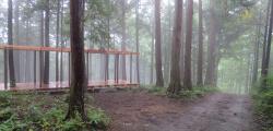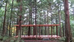 A new approach to the natural landscape of Oawa mountain, a protected and sacred forest located in the town of Kamiyama, Japan. The region is covered by evergreen woodland where the predominant vegetation includes trees of hinoki 檜-Japanese cypress- and sugi 杉-Japanese cedar-. In-between pavilion consists of a sugi wooden space generated from two elevated planes supported by a series of vertical elements -trunks of hinoki and sugi- that merge together with the natural environment.