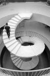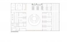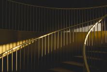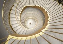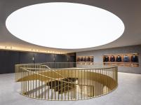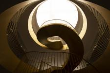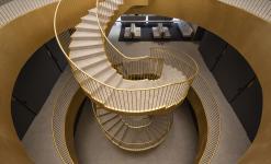 In the interior, the dark opaque vertical paraments mean that the light from the skylight illuminate the staircase in an almost ceremonial way, The staircase, seen from different view points, seems to be a set of linked wedding rings, while the gold tones distinguish it as the neurological element of the project. The combination of whites, greys and gold marks out the spaces, with each establishing a different dialogue with the natural light that penetrates the building.