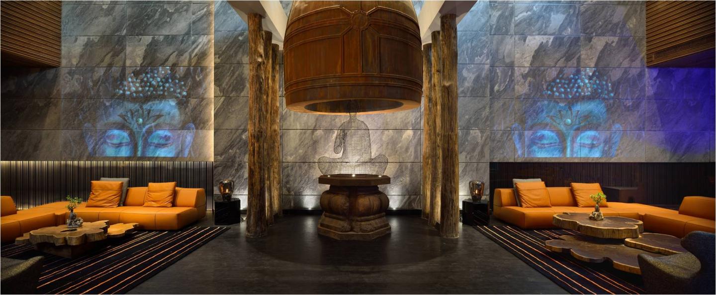 Taking staircase from the stilt floor to the basement, the entrance foyer leads to huge party hall with a heavy weighing metallic bell in the centre. On the left is the dance floor and screen, and on the right is the bar area extending to the outdoor landscaped area with a live tree and water body.