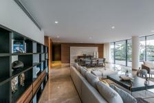 The design concept was structured around the premise that the house puts the essence of family life at the forefront. The 10000 sq-ft, ground plus one-upper and basement, sprawling house, therefore, sits harmoniously on a contoured land establishing a strong inside-outside connect. Conceived as a series of spaces inter-connected and spilling-over onto a linear verandah on the first floor or a direct step out into the patio connecting to the covered decks that form a part of both the landscape and the inner space. The house is thus oriented to maximize natural light and designed to suit the contemporary lifestyle of the client. Large sliding doors separate the verandah space from the internal living space. The centrally located kitchen on the lower floor and the family room on the first floor acts as a core & connect between the bedrooms and the living. The skylight on the central core forms a direct link between the levels and adds a playful drama to the spaces.