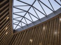 The interior has 8 wooden pillars and 3 diagonal wooden pillars at the front end. Structurally, we realized a 34.0mx14.5m indoor pillar-free area and a 3.7m outdoor cantilever. Using smoke-gray aluminum-magnesium-manganese shingles, ultra-white tempered glass, and the spruce ceiling, the leaf-shaped exterior contour completes the expression of the microscopic force.