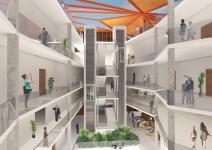 The building function revolve around a central communal atrium, that has skylight to bring in natural light as well screen to optimize the light. The entrance to the building is through a plaza. Before entering the building, the plaza opens into a recessed space under the building which is shaded by the building itself. It then move up leading to the entrance.