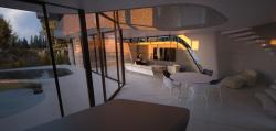 The first floor is been organized on two separate wings separated by a central double high space that contains the vertical circulation. A skylight has been incorporated into the roof design to accentuated the spatiality and enhance the symmetrical composition and functional organization of the house. In the North-West wind, two rooms are allocated with a common bathroom in-between. In the Northeast, the master bedroom with a dressing room and en-suite bathroom is located. The master bedroom takes advantage of the morning sun from the North- East and the best views to the mountains over the North-West.