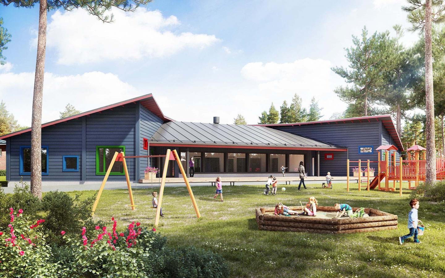 In the design of the day-care centre, attention has been paid to the surrounding nature, natural light and a pleasant acoustic environment. In the architecture, large building masses are divided, together with outbuildings and playhouses, into smaller "huts", closer to the children's own scale. The architectural modellings make of the yard a protecting lap for the children, where it's nice to play.