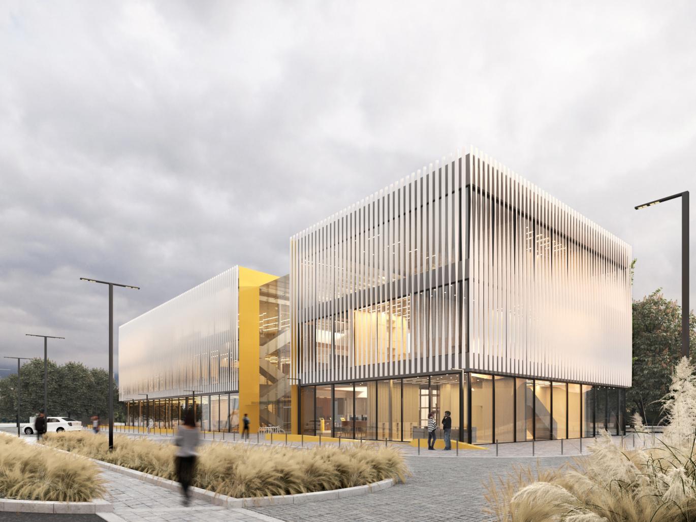 The volume of the building was divided into three blocks to highlight on the main entrance. The central block was conceived as the atrium. The other two parts have horizontal connections between them through the volume of the central transparent block. The glass part of the building serves as a visual bridge between the street pedestrians and the natural environment of the park behind the designed building.