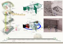 I have two carved spiral ramps, the first one took the visitor vertically down, the other takes them back. During this movement the visitors get through seven stations, that have been divided according to researches accurate readings, reviews, and interviews for all the events that the faithful people have got through in this site and transfer those stations to generic names that are compatible with the three great religions, which are: Portal, Journey, Destination, Turning Point (Christianity Era), Discovering, Prosperity (Islamic era) and Reflectance (Remembrance).