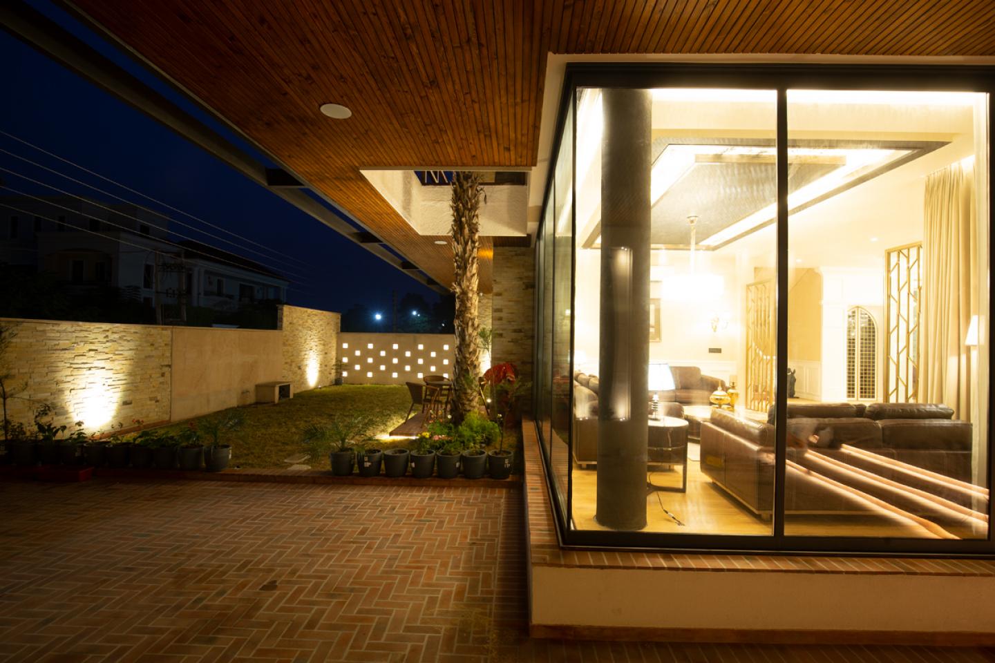 The optimization of spaces to portray a palatial character is the prime philosophy followed. The outer façade of the abode resembles an ethnic European villa with rustic textures. The mansion-like appeal also attributes to the sloping roof, which fulfilled the client’s requirements and the classical columns that demarcate the inner entrance. Further, when one enters the built environment, it is intricately embellished with several repetitive niches to add a bamboo feature to the wall on the left end and jasmine aroma at the right. The porch and the exterior hardscape are erected with molded bricks formulating herring and bone pattern. The use of brick tiles here not only gives a natural, aesthetic, and softer outlook with time but also tends to retain warmth during the cold weather and moderates temperature in the summers. It also enables water penetration to the earth due to its porosity, thus maintaining a healthy softscape around as well.